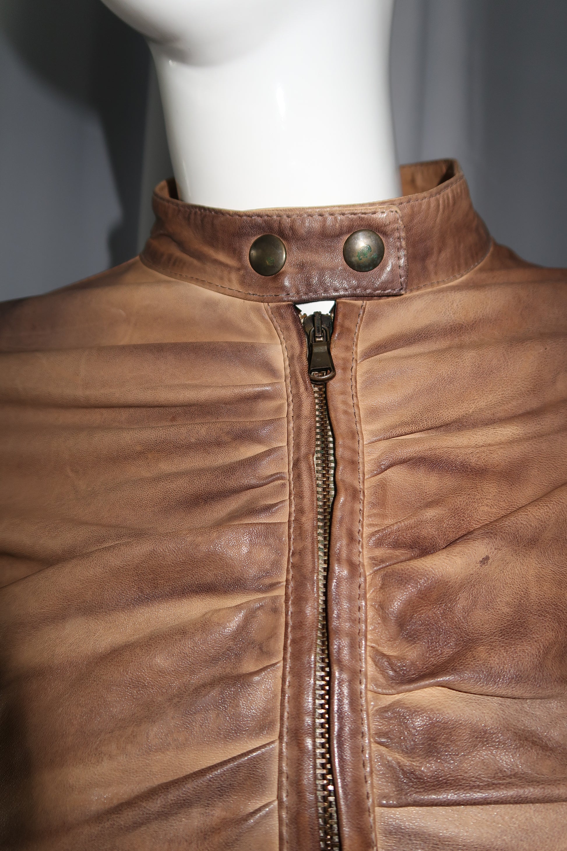 close to body fit, distressed washed effect on leather, zipped sleeves