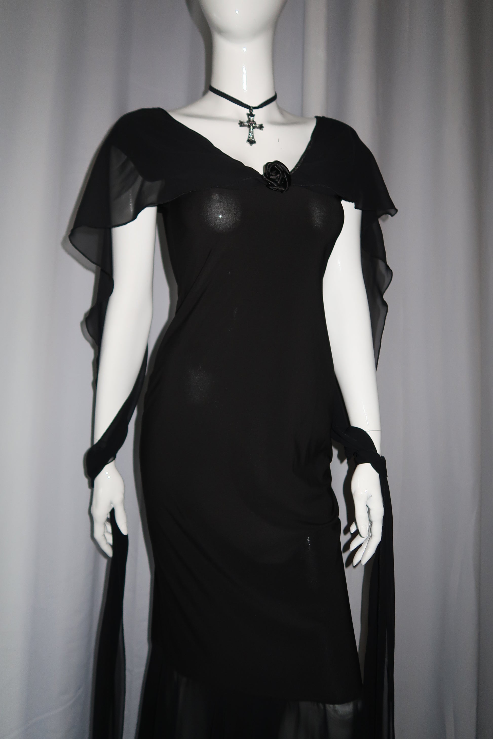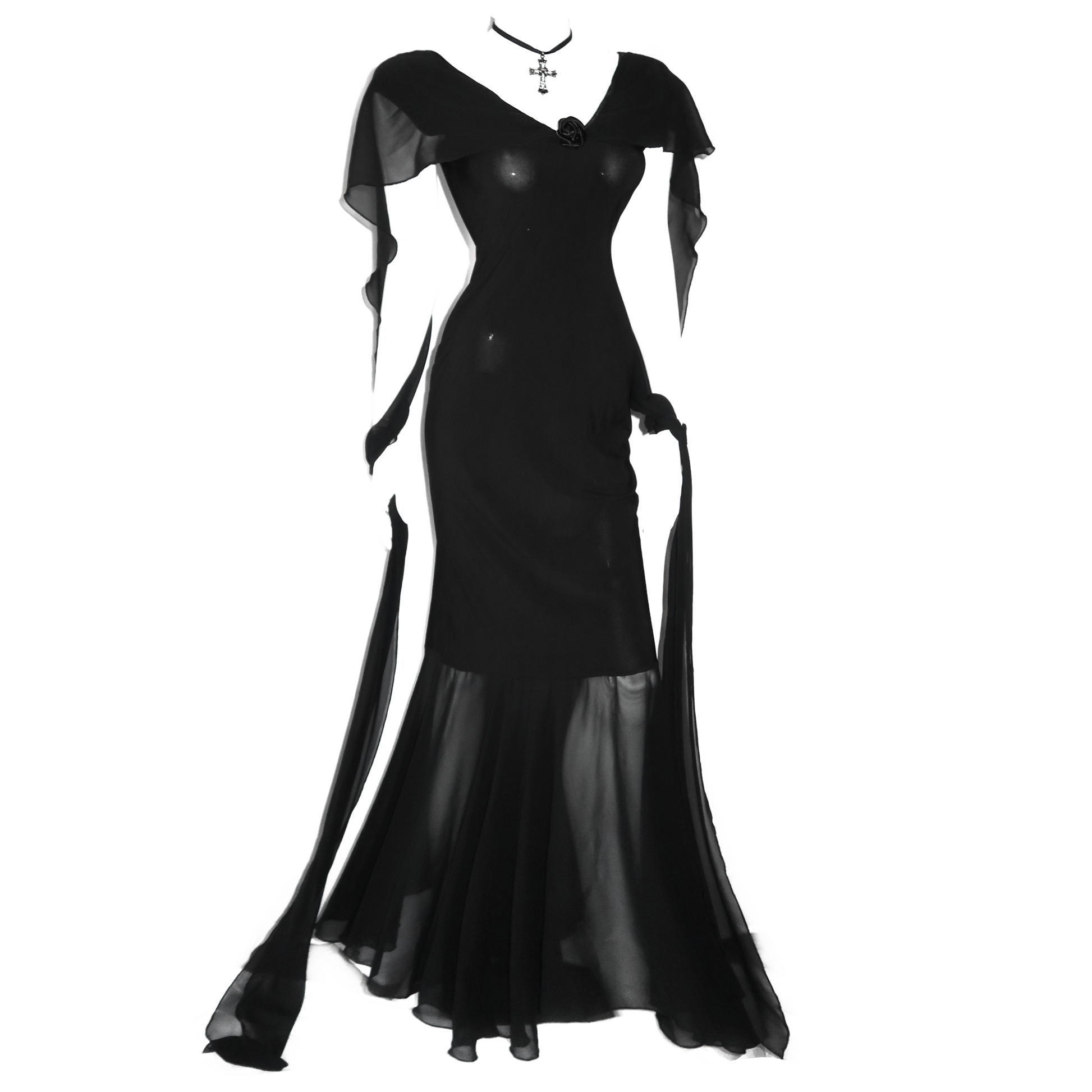 Vintage long prom dress with rose on neckline and mesh veils