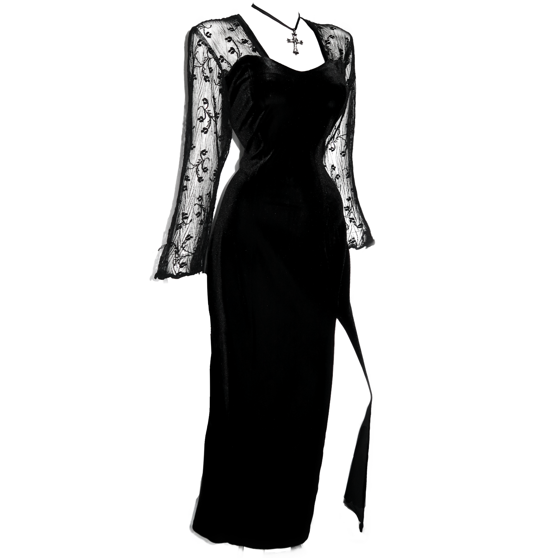 Vintage black velvet dress with lace sleeves and cut out for leg