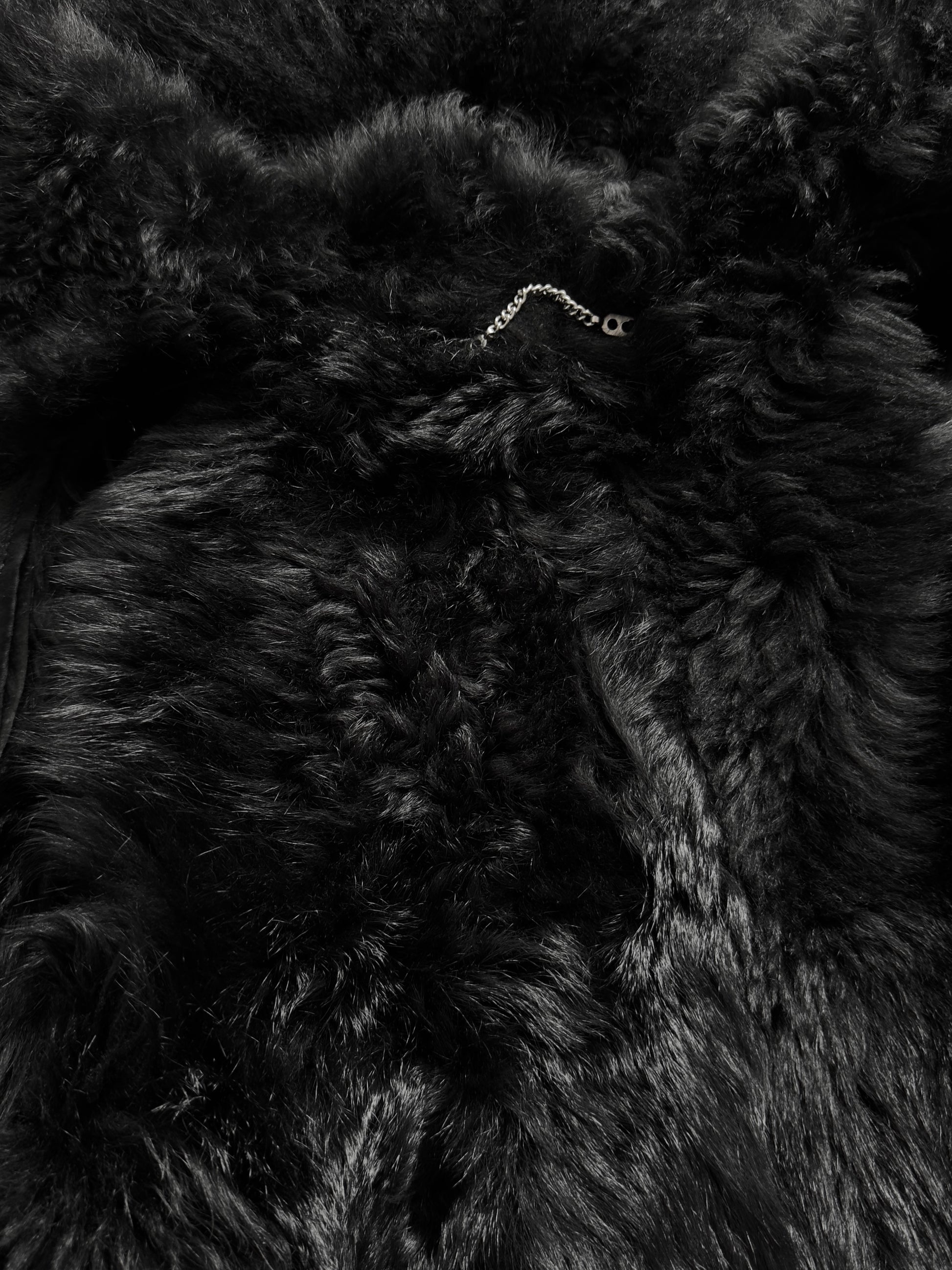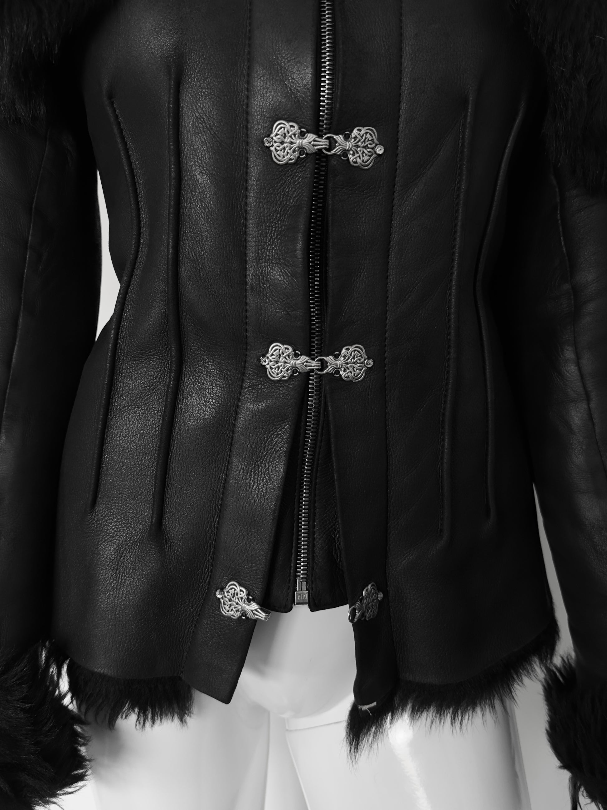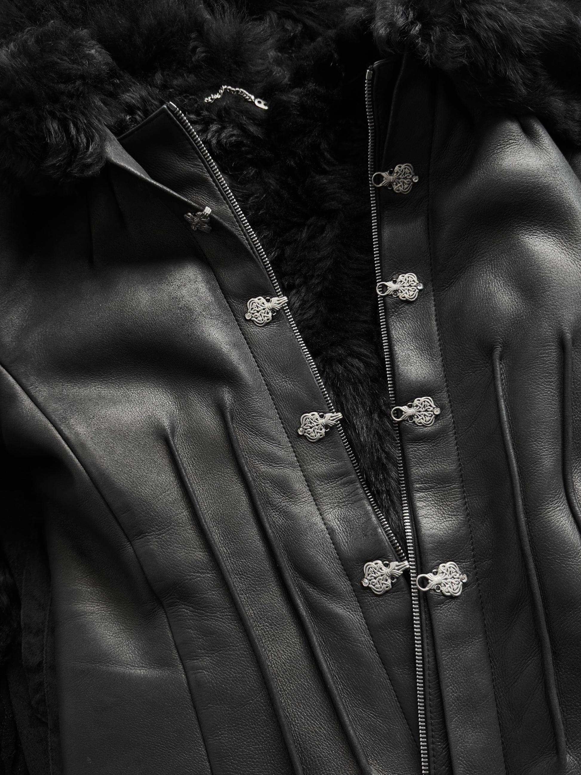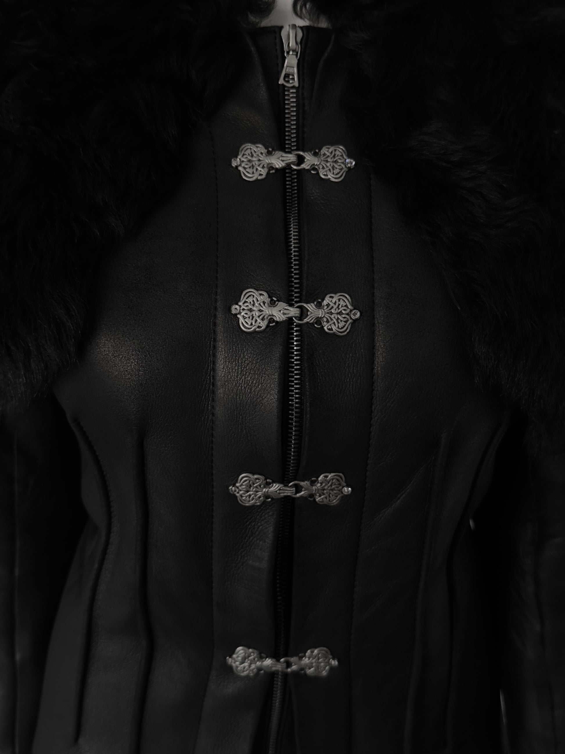 Unique Vintage gothic leather corset jacket with faux fur asymmetrical raw cut cape and ornamental silver hardware buttoning